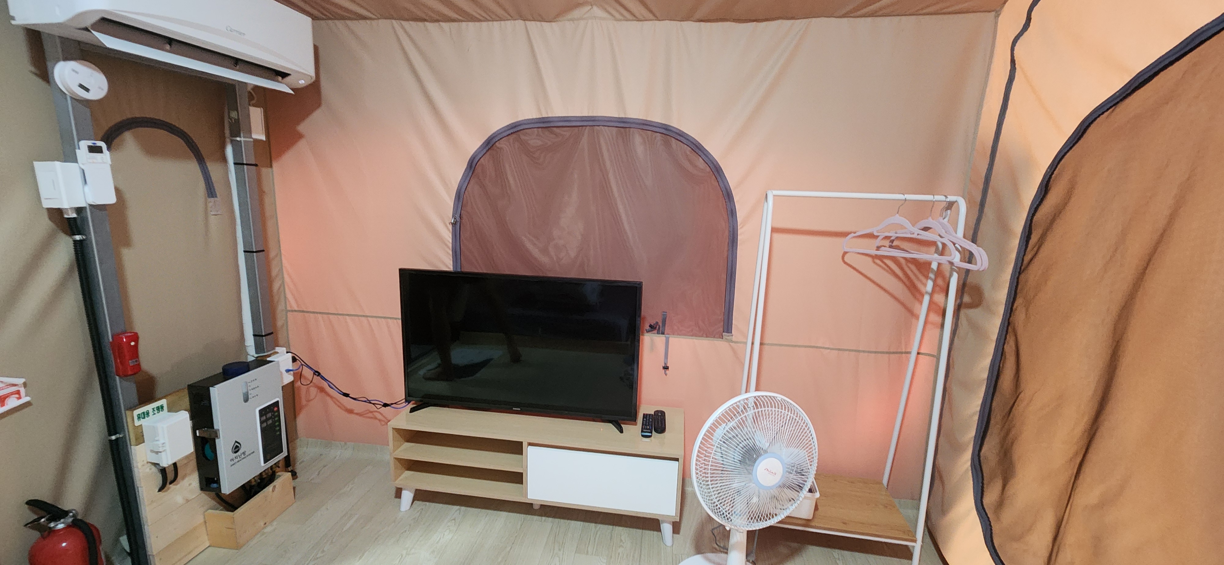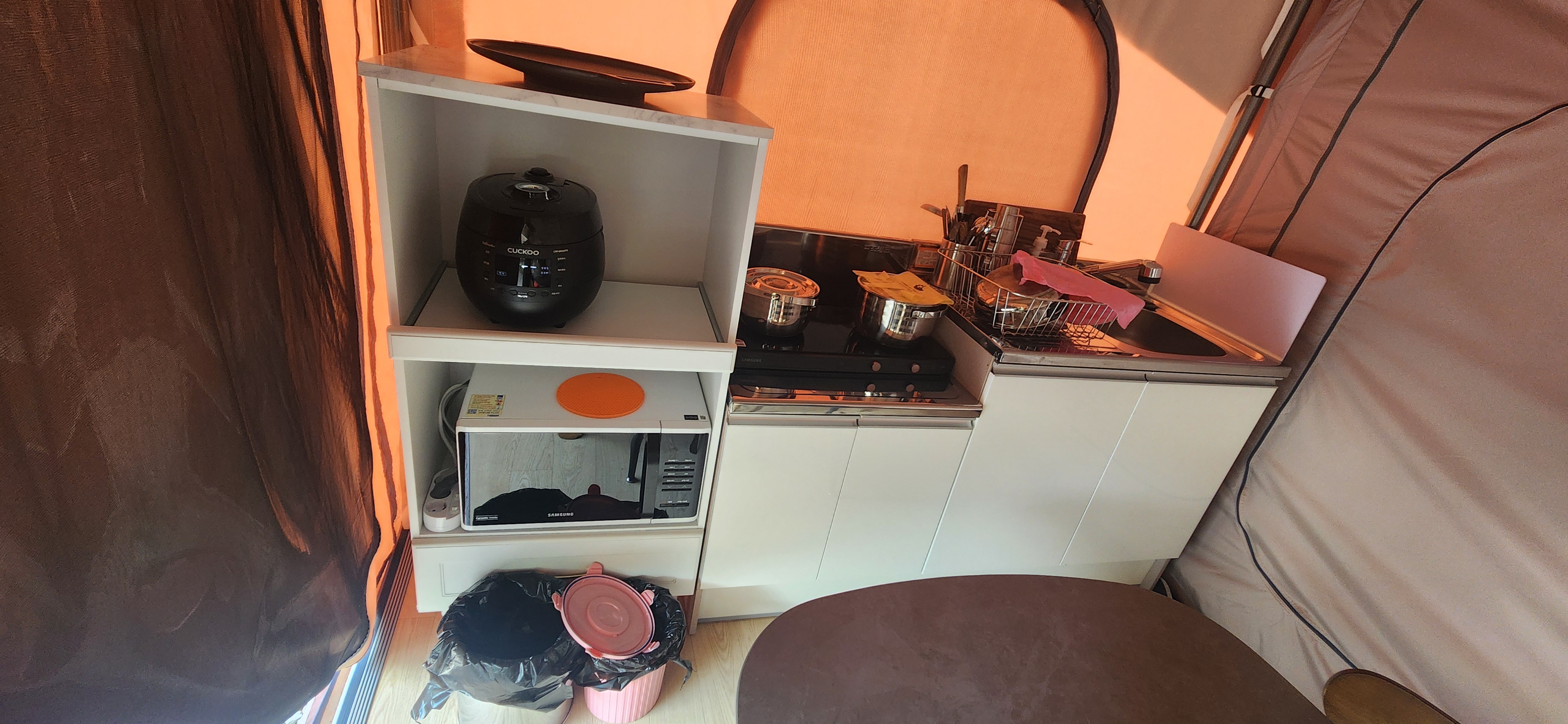 - 글램핑장 내부 : 일단 집에 있는건 여기 다 있다고 보면 된다. 수저, 그릇, 냄비, 접시 등은 4인 기준으로 있었다. 전자레인지, 밥솥, 버너, 인덕션, 불판, 컵, 칼, 가위, 집게, 냉장고, 티비, 에어컨, 선풍기, 드라이기, 샴푸, 바디워시, 휴지, 수건 4개, 옷걸이, 쓰레기통, 음식물쓰레기통, 종량제 봉투, 음식물 쓰레기 봉투 등이 있었다. 4인 식탁도 있고, 바깥에 야외용 테이블도 있다. 없는게 있다면? 바로 칫솔, 치약. 직접 가져 오면 된다. 없으면 매점에도 팔기 때문에 사서 써도 된다. 침구류는 포근하고 깨끗하고 컨디션 최상이다. 다만 아직 베개가 새것이라 빵빵해서 높은 베개가 불편한 사람은 가져오는 것을 추천한다.^^