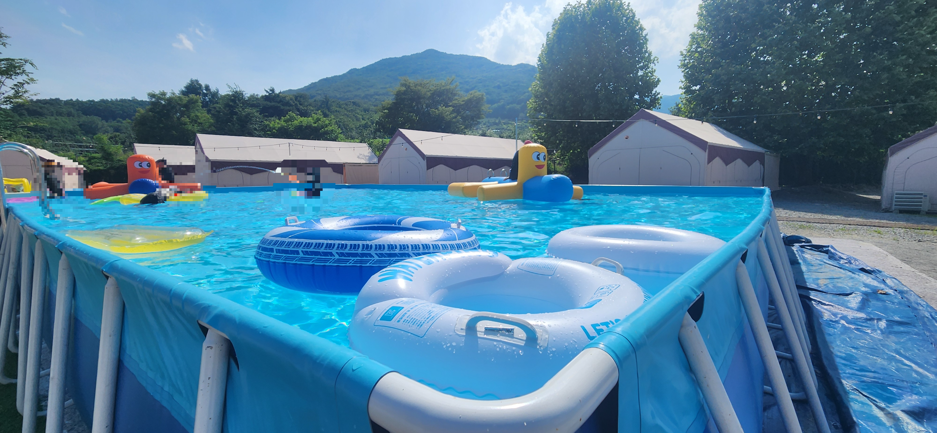 - 수영장: 7~8월에만 누릴 수 있는 수영장! 홈페이지 사진으로는 부족하다. 직접 가봐야 안다. 미끄럼틀 수영장, 넓은 풀장 2개가 마련되어 있었다. 대박이다. 관리도 열심히 해주셔서 물이 깨끗하다. 캠핑장과 달리 딱 12개 동만 운영하고, 추가 인원은 금지라서 이용하기 쾌적했다. 붐비지않게 하루 종일 놀 수 있다. 아이들은 바로 놀기 시작하더니 마감 시간인 7시까지 수영장에서 놀았다. 다음 날도 눈 뜨자 마자 사장님이 정리해 주시자마자 바로 들어 가서 퇴실 할 때까지 놀다가 나왔다. 워터파크보다 재미있다고 하니 할말 다 했다. 수영장 때문에 또 오자고 했다. 방학하면 평일에 다시 한 번 갈 예정이다. 올해 물놀이는 여기로 정했다!^^ 튜브, 물총 등 여러 용품들이 있었다. 더 다양한 튜브를 원하면 대여해도 된다. 5000원. 구명조끼도 있다.