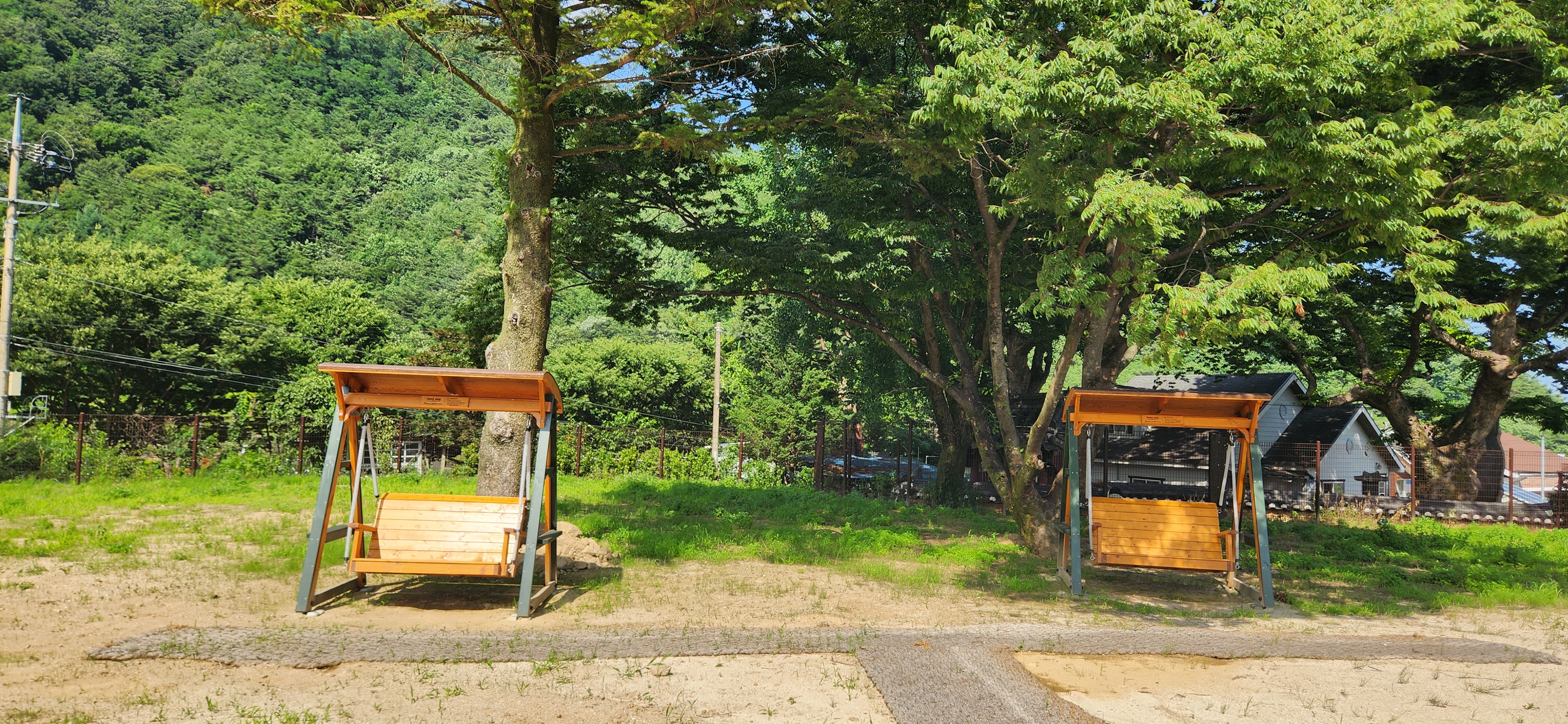- 글램핑장 야외 시설 : 테이블도 곳곳에 있고, 흔들 그네도 있고, 450년이 넘은 고목과 여러 나무가 잘 어우러진 아름다운 곳. 쓰레기는 주차장 옆에서 정리하면 된다. 어찌나 열심히 관리를 하시는지 쓰레기장 마저 쾌적하다. 수레가 있어서 짐은 주차장에서부터 수레에 싣고 옮기면 된다.